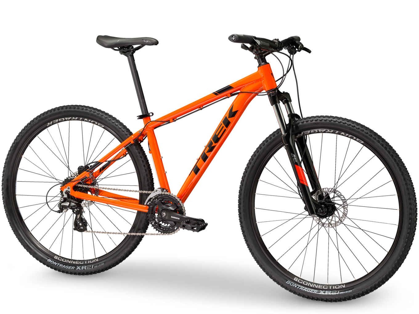 - Bontrager XR2, 29×2,20″ al frente, 29×2,00″ atrás (13,5 & 15,5: 27.5×2.20″)